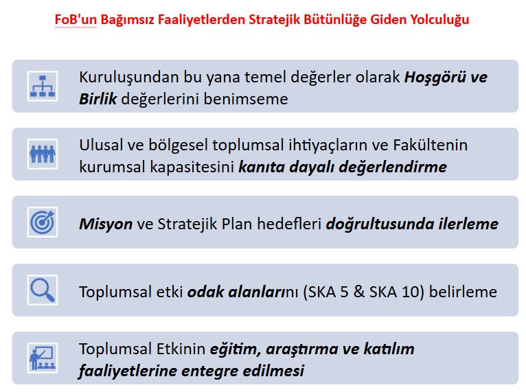 2018 yılında AACSB Akreditasyonuna başvurumuzun ardından, Fakülte, birbirinden bağımsız faaliyetler yürütmekten stratejik ve ölçüm temelli bir çerçeve uygulamaya geçiş yapmıştır. Bu dönüşüm, kritik bir eksikliğin tespit edilmesiyle tetiklenmiştir: tanımlanmış bir hedef beyanı, odak alanları ve toplumsal etkiyi değerlendirmeye yönelik sistematik bir sürecin eksikliği. İşletme Fakültesi, bu sürece vizyonu, misyonu ve sürdürülebilir kalkınma amaçlarını destekleyen ve öğrenciler, mezunlar ile sivil toplum kuruluşları dâhil olmak üzere tüm paydaşlarla iş birliği yoluyla değer yaratmayı kapsayan temel değerlerini dikkate alarak başlamıştır. Tüm paydaşlardan geri bildirimler arama konferanslarından anketlere ve odak grup toplantılarına kadar uzanan çeşitli veri toplama araçları kullanılarak elde edilmiştir. Arama konferansını takiben gerçekleştirilen istişare toplantıları, ulusal ve bölgesel verilerin kapsamlı analizi ve İşletme Fakültesi’nin kurumsal kapasitesi ile stratejik konumlandırmasının değerlendirilmesi sonucunda, SKA 5 (Toplumsal Cinsiyet Eşitliği) ve SKA 10 (Eşitsizliklerin Azaltılması) Fakültenin öncelikli odak alanları olarak resmen belirlenmiştir. |