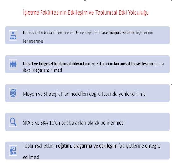 İşletme Fakültesi, bu sürece vizyonu, misyonu ve sürdürülebilir kalkınma amaçlarını destekleyen ve öğrenciler, mezunlar ile sivil toplum kuruluşları dâhil olmak üzere tüm paydaşlarla iş birliği yoluyla değer yaratmayı kapsayan temel değerlerini dikkate alarak başlamıştır.